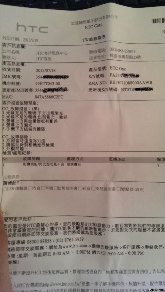 我的黑ONE,7/18拿去7-11送修~7/23號回來!這張是維修單,我的黑ONE拍的,看得出來一樣有紅中問題...相機方面我明明有講紫光和紅中問題!紫光解決的,紅中依然存在還有螢幕上方兩處漏光,回來這支依舊漏光,兩處位置一模一樣,只是變得比較不明顯一點點...送修前是在正常光源處看就很明顯,現在是要仔細看一下,不然就是在稍微暗的地方漏光才比較清楚...手機下方有細縫回來變成上下都有不過不影響使用,無視它了!其他像是電源鍵歪歪的,正面看左高右低...音量鍵從同心圓鋁合金料件變成塑料?!似乎還有同心圓,只是超不明顯音量鍵和螢幕之間有縫隙,從某個角度看的到裡面藍藍的不知道是啥...(請問大家這是正常的嗎?能正常使用是還好,只怕時間久了灰塵啥的容易跑進去,這樣如果故障的話,在保固維修不用錢吧?比較在意的其實是原本鋁合金同心圓音量鍵超有質感的...換成這以上手機外觀沒有照片,因為我沒有其他可以照比較清楚的相機或手機...這支黑ONE我接受了,我只用了1個月智慧型手機,再用回智障型手機1個禮拜就快受不了,我回不去了懶得再送修,只怕下一支又是其他方面的問題,使用方面不要故障就好了最後補充~我不是工讀生!我很喜歡NEW ONE這支手機~希望HTC再加油一點!我黑ONE快過保前一定還會再送修一次,希望那時回來的手機在各方面能更完美!PS.對了~我送修回來,盒子裡怎麼沒有拭鏡布,也沒有保護貼...該不會都送完了吧?!