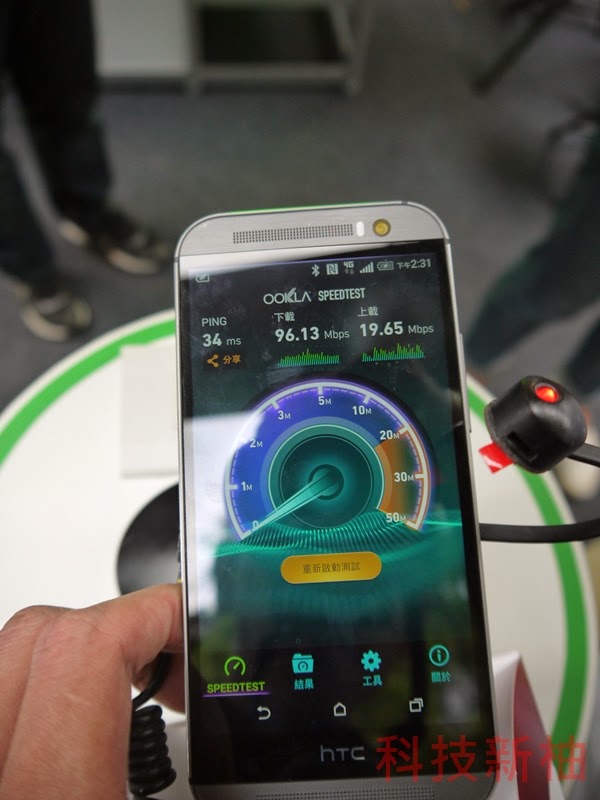 筆者也盡可能的找空檔拍到大家想知道的重點,像是和前一代 HTC One 的外型比較等等,此外,今天國內三家電信公司也首次公開展示 4G LTE 試營運的成果,不過現場雖然各家電信都寫著「體驗 4G LTE」,他們也只能讓你去使用內建的 YouTube 或是瀏覽器來感受,並不能下載任何軟體,而 SpeedTest 偏偏又是用了 4.4.2 之後不支援的 Flash,所以筆者算是偷偷跑測試的.......。