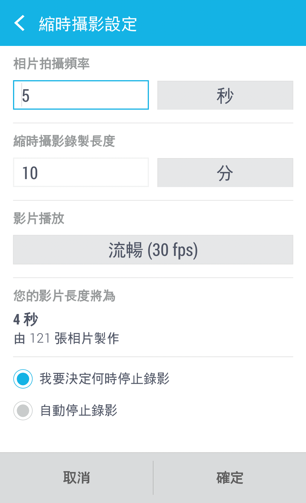 它的縮時拍攝是每幾秒拍一張照片,然後在一定的時間內把這些照片播完,裡面的設定都可以自己更改,像這裡是設定每5秒拍一張,總個拍10分鐘,因此共由有121張照片組成,一共會在4秒鐘播完這121張照片(也就是這10分鐘的內容)