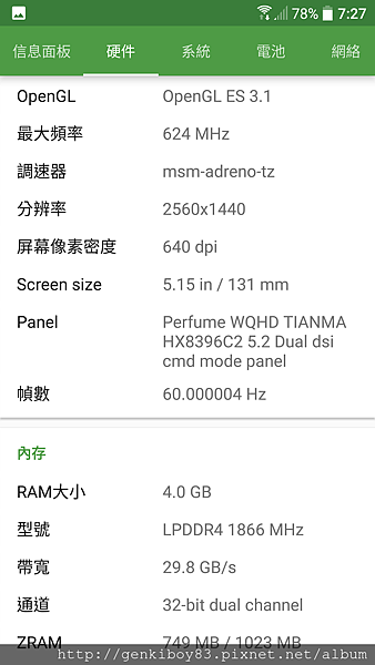 看一下硬體規格,S820 CPU、4G RAM、Adreno 530 GPU、2K螢幕, 不過螢幕是天馬屏就是了,我個人是沒甚麼特別喜好,只是有些人會覺得是奇摩子問題。說實在我其實寧願用1080p的螢幕,也不要用2k的螢幕來消耗多餘的電力......