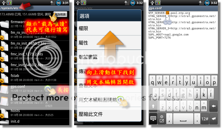 冒昧請問一下...每次刷機建議事項2. 修改 /system/etc/gps.conf,將第一行改為 NTP_SERVER=tw.pool.ntp.org3. 刪除 /data/location 資料夾4. 修改 /etc/wifi/tiwlan.ini,HT_enable=1 改為 0 (關閉802.11n,只用802.11g/b請問這些是要用什麼程式才能修改並存檔呢?2那一項我有載TAIWAN.ZIP刷,但好像沒用?小弟剛刷179底板+0722-1010,還煩請大大幫忙一下,感恩。謝謝。