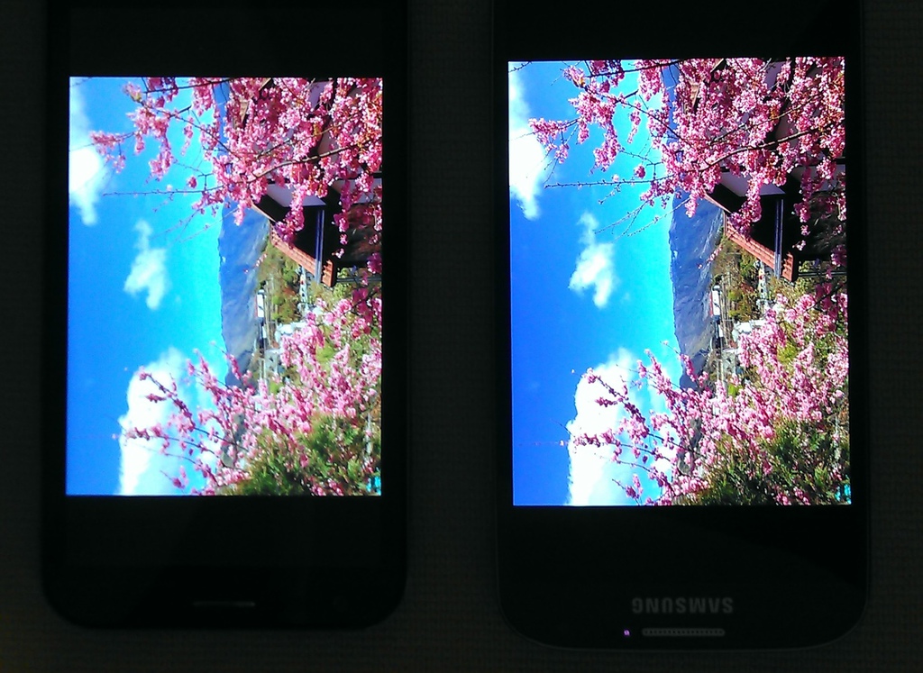 左邊是Padfone2,右邊是S4,兩者都是最高亮度...其實亮度和發色都差不多。