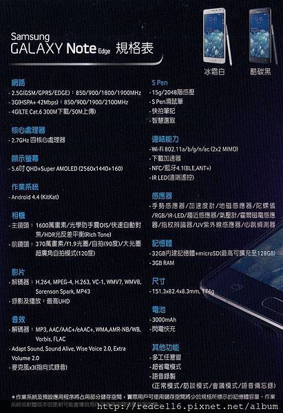 GALAXY Note Edge,除了感受到GALAXY Note Edge金屬邊框打造出來的弧形溫潤曲線式包覆5.6吋QHD SUPER AMOLED (2560 X 1440 + 160)2K高清大螢幕,不單單只是全面大幅提升使用者的感官與視野,透過獨家的側邊Edge螢幕讓你可隨心所欲的在Edge螢幕這獨特的空間中去打造屬於自己專屬的曲面快捷列(體驗會的分組競賽中就已經見識到01網友在極短的時間內就可以創作出各樣生動有趣且活靈活現的Edge螢幕桌布),讓使用者可以更全面更快速的掌握更多生活重要資訊。側邊Edge螢幕可以單獨也可以輔助全螢幕顯示及輔助拍照及遊戲等功能,讓使用者不但可以同時使用主畫面又可以從側邊螢幕得到即時對應輔助資訊,真的是有如虎添翼的功效;夜深人靜SAMSUNG GALAXY Note Edge還有宛如阿拉丁神燈一樣,在待機模式下輕輕上下滑動側邊Edge螢幕就能顯示訊息、日期、天氣及時間等資訊的夜間模式,是集節能及智慧人性於一邊的使用高科技介面,SAMSUNG GALAXY Note Edge除了獨樹一格的側邊Edge螢幕外,本身其他的硬體也是一等一的強大,除了有跟NOTE 4同級的感壓升級至2048階的S Pen滑鼠筆來進行智慧選取等功能,讓使用者擁有無以倫比的數位手寫使用經驗,讓SAMSUNG GALAXY Note Edge一機在手也能輕鬆一筆定江山!而使用者也能透過SAMSUNG GALAXY Note Edge的後置感應快門、間隔快門、快拍筆記及120°大光圈超廣角及多段美肌功能,無論是上班族、學生族、孤男寡女還是人山人海也能夠用SAMSUNG GALAXY Note Edge一機通通拍的好!還有多工任意窗可以一心多用及30分鐘快充等多樣功能讓你體會到SAMSUNG GALAXY Note Edge的無所不能的強大旗艦魅力!