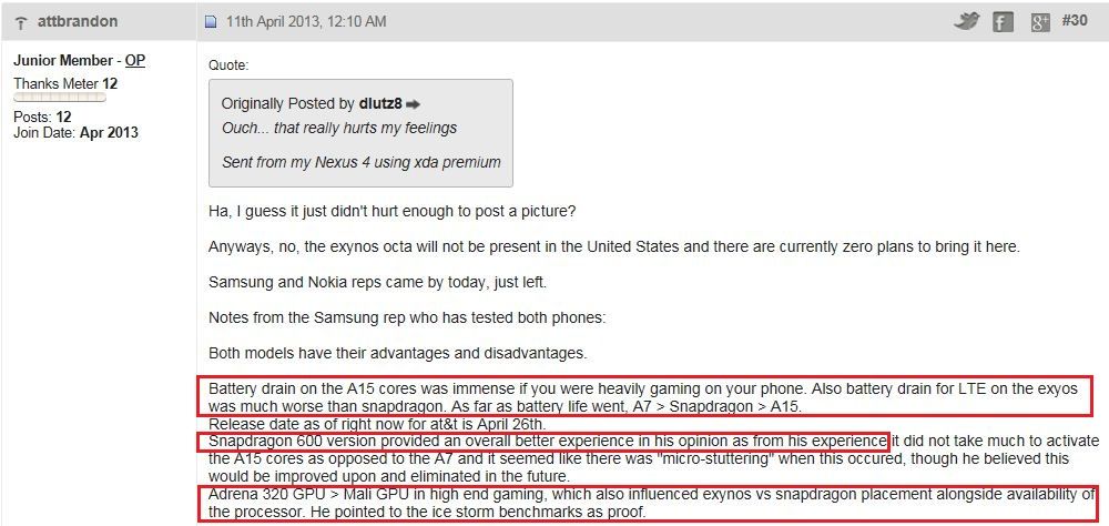 根據個人體驗,該三星代理商的的意見是高通Snapdragon 600版本的S4提供了比較好的整體體驗。(Exynos版本的)A15核心要被啟動,並不需要高負載的程式,在A7 <-> A15切換的過程中似乎會帶來輕微的頓挫感,該代理商相信這個問題未來會被改善。
