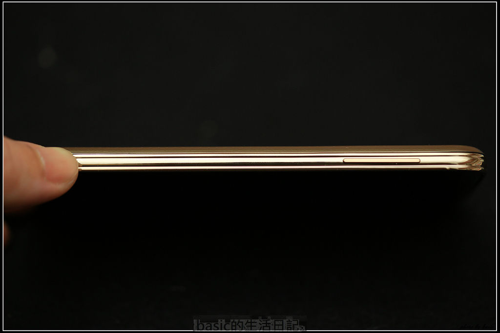 ,官方的照片根本看不出來這種實機感,背蓋是淺圓凹點防滑設計,而且還有仿皮革紋路,一點也不像是ok蹦或衛生用品,最漂亮是正面的深咖啡色質感,跟前側邊框,相機,Home鍵,指紋閃燈等..金色邊框,整體的塑膠質感也滿分了