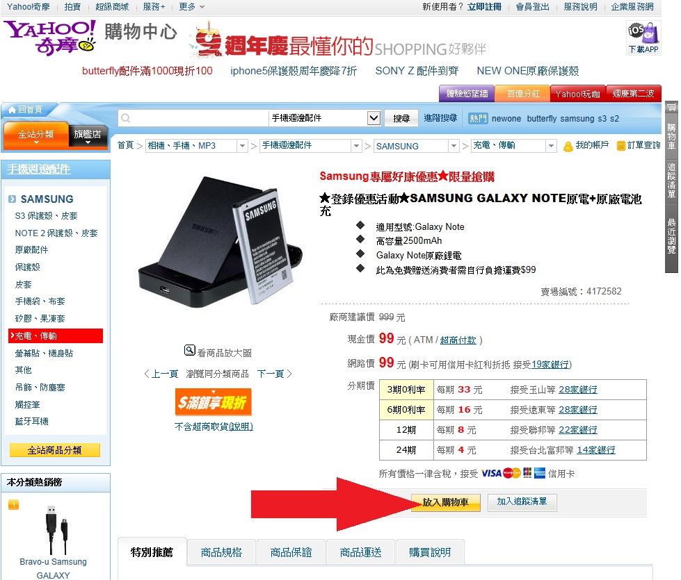 ▼ 你就會直接連到Yahoo奇摩購物中心的專屬賣場(或是PChome購物中心的賣場,每個人的連結不一樣),然後就會看到原價999元的原廠充電組,感恩回饋價只要99元,還等什麼,趕快點選放入購物車啊~~~(笑)