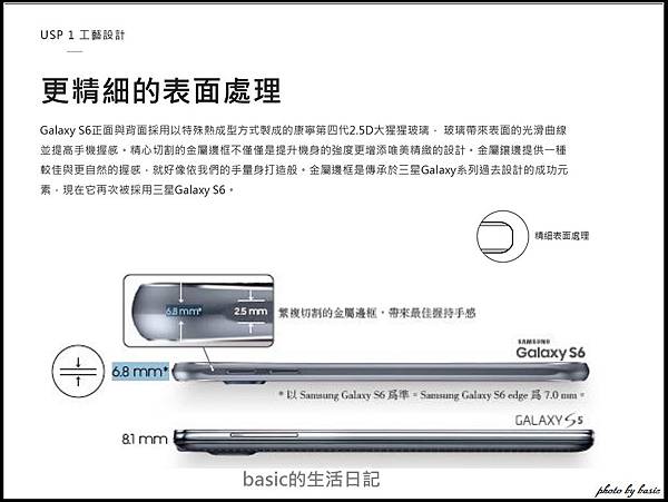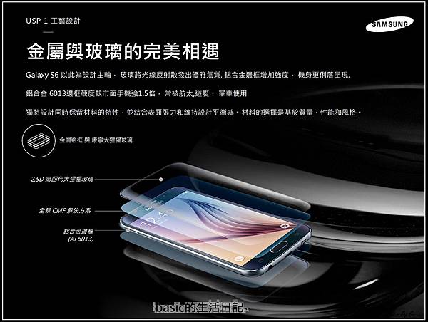 雙側邊曲面 , 鋁合金邊框 , 鑽石切邊 , 正反面皆為康寧4代玻璃 , 讓S6/S6 Edge營造出相當好的質感..