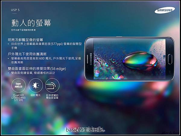 這次的S6/S6 Edge搭載的是5.1" 2560x1440解析度的Super Amoled螢幕 , 解析度高達577ppi , 不只是解析度超高 , 顏色更加的準確 , 連亮度也一併提高了..