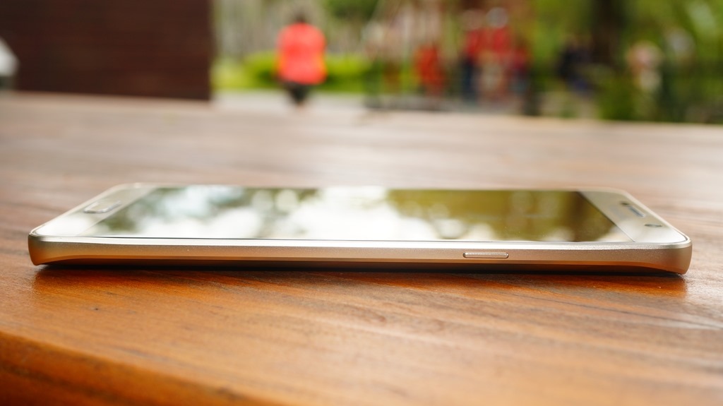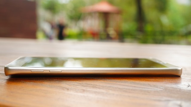 右側邊這裡,只有電源鍵。由於Galaxy Note 5承襲Galaxy S6與Galaxy S6 Edge的設計,所以看到側邊,就會有很熟悉的感覺。