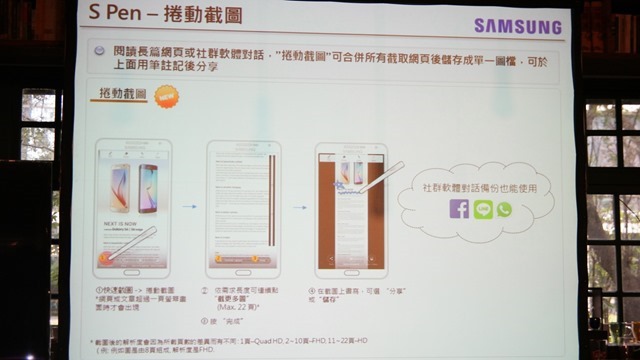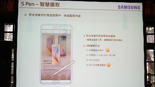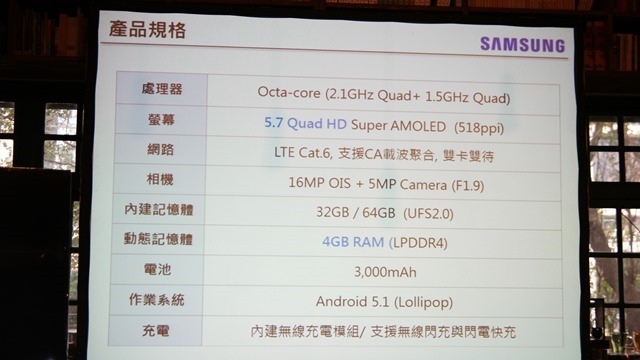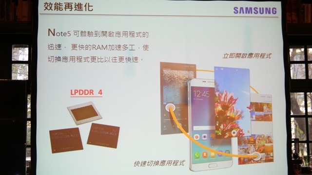 以下照片是體驗會上,三星產品經理Stan介紹時所秀的產品規格(詳細產品規格,請點選這裡觀看官網介紹)。其中,內建4GB LPDDR4 RAM,我覺得在接下來一段時間內,使用上的順暢度都不會有太大問題才對。另外,藉由這場體驗會也確定目前在台灣不會販售128GB儲存容量的Galaxy Note 5。