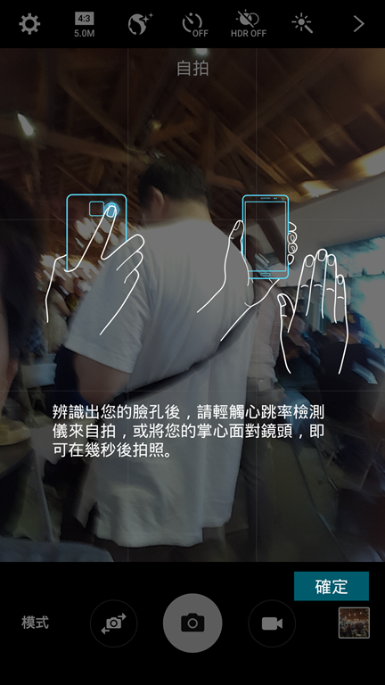 前鏡頭內建的拍攝模式有六種,自拍時只要按住心跳率檢測儀,或是將掌心面對前鏡頭,就能進行拍照。