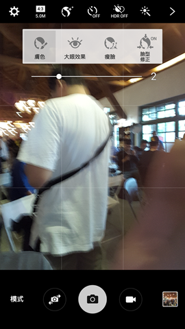 自拍這部分,就請現場的SG幫忙一下。而試了幾種組合之後,我們覺得膚色、眼睛大小、瘦臉效果調整為4,然後臉型修正關閉時調整的效果最OK,不會太過頭。以下兩張照片,第一張是關閉臉型修正,膚色、眼睛大小、瘦臉效果調整為0,而第二張照片一樣關閉臉型修正,膚色、眼睛大小、瘦臉效果調整為4,請參考一下。