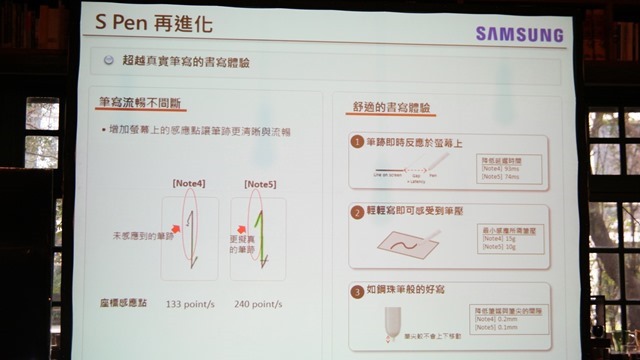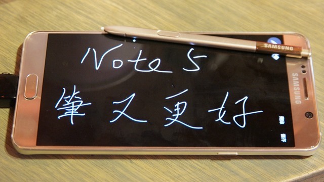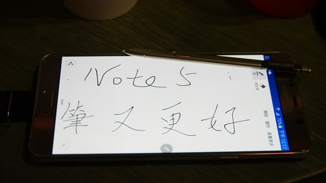 S Pen在Galaxy Note5也再進化,除了螢幕的座標感應點比Galaxy Note4提升快一倍外,S Pen筆跡的即時反應、感壓反應、筆尖間隙都會更舒適。