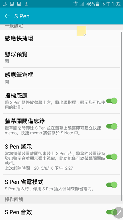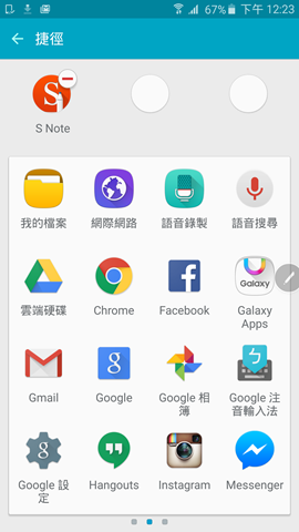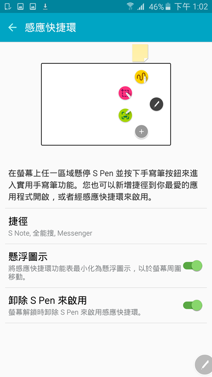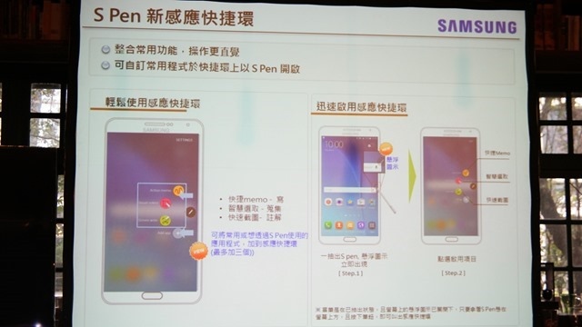 既然是Note系列,當然也要看看S Pen有什麼新功能,讓S Pen更好用!其中,只要一取出S Pen,感應快捷環就會自動出現。而Galaxy Note 5感應快捷環,預設提供快捷Momo、智慧選取與快速截圖三項,此外可以讓使用者自行增加三種自己常用功能在感應快捷環上。