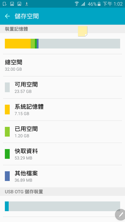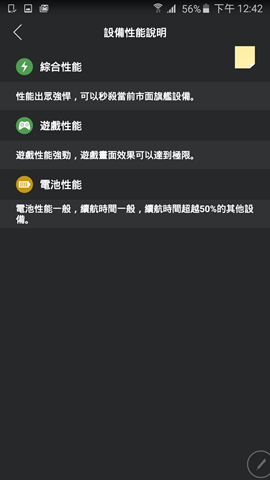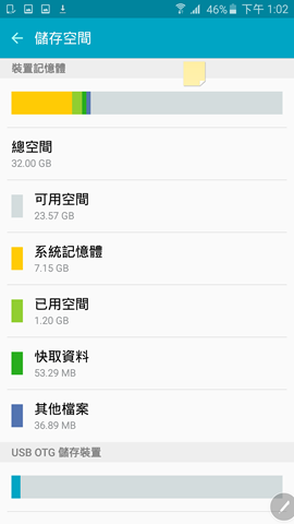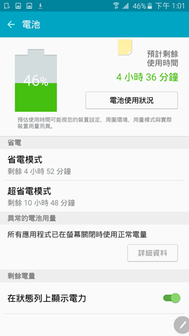 測試前,看一下目前電池剩餘電量與儲存空間資訊。以電量來說,根據當時的數據反推,100%電力下,Galaxy Note 5可用時間會在10小時整。另外,32GB的儲存容量,在預設的軟體安裝後,剩餘可用的容量會落在23.5~23.7GB間。