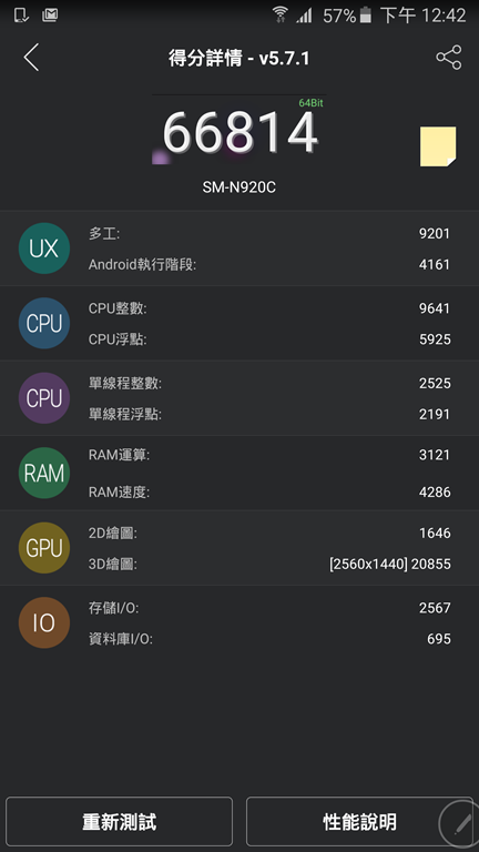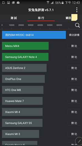 以安兔兔測完後,手上這隻Galaxy Note 5的分數為66814。