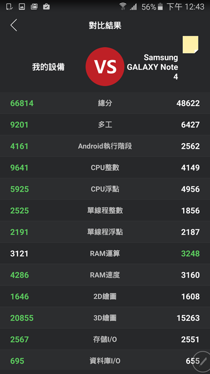 跟Note 4相比,總效能部分,Note 5超過Note 4有37.4%。而單項的效能分數,除了個人感覺有些奇怪的RAM運算項目外,其餘項目都是Note 5效能比較好。