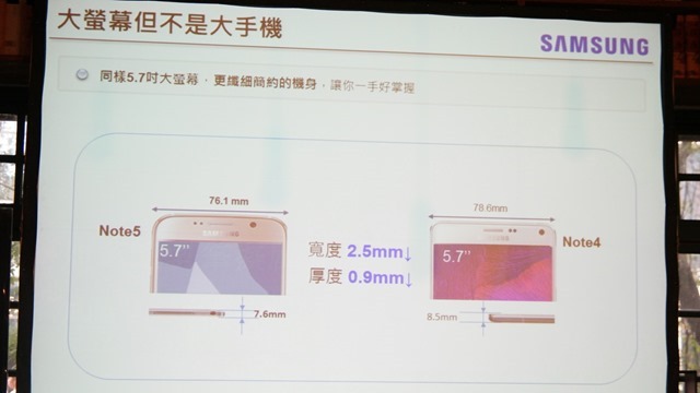 跟Galaxy Note 4相比,Galaxy Note 5維持5.7吋螢幕不變,但寬度反而減少2.5mm,厚度也少了0.9mm,因此機身更加纖細。