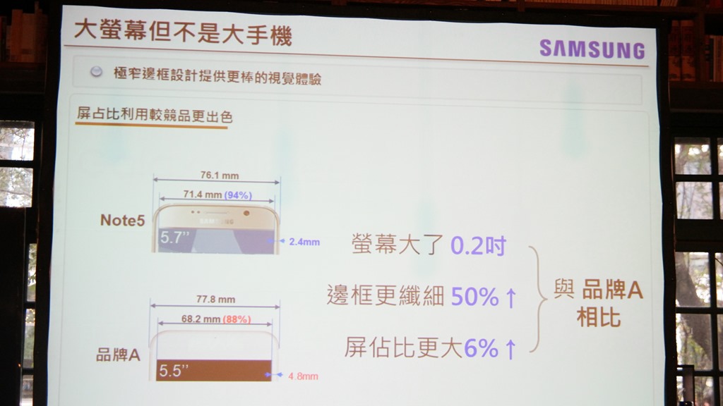 與A品牌競爭對手產品相比,Galaxy Note 5的螢幕不但大了0.2吋,螢幕離邊框只也有2.4mm,比對手少了50%以上,因此屏占比對手大了6%以上。
