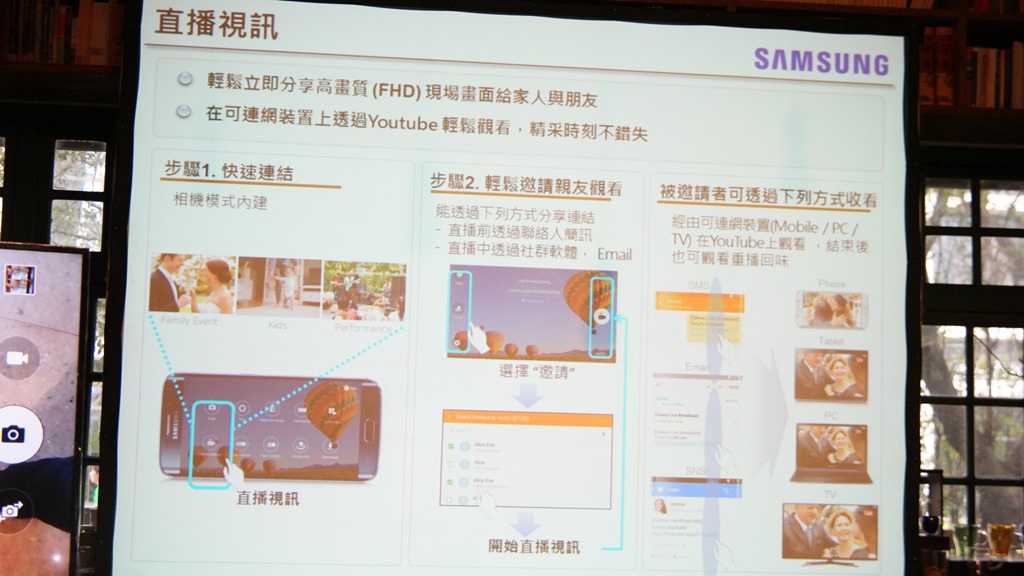 Galaxy Note 5的相機模式,內建了視訊直播模式,可以透過簡訊、Email與社群軟體,邀請親朋好友透過自己的設備,到YouTube上觀看,並且在直播結束後,也能觀看重播回味。