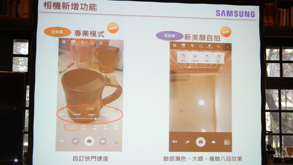 至於體驗到的新功能,首先自己最注重的相機功能,在專業模式多了快門選項,讓專業模式有更多發揮的空間,但我自己還是希望在不久將來,在專業模式中可以看到光圈調整選項的出現,那這個模式就真的大大地有用了!此外,短片拼貼模式、直播視訊與前鏡頭自拍模式可以針對膚色、眼睛大小、瘦臉效果與臉型修正進行調整,也都是不錯的新功能。而S Pen部分,除了S Pen本身質感更好外,可以新增自己常用項目的新感應快捷環、捲動截圖、隨手Memo也讓S Pem更好使用,也讓生活或工作隨記更便利!