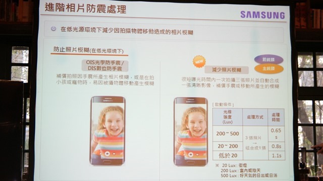 除了原有的OIS光學防手震與DIS數位防手震,Galaxy Note 5新增了相片防震處理,會自動辨識當環境光線低於500Lux時,就一次拍攝三張照片,然後自動合成一張清晰的照片。
