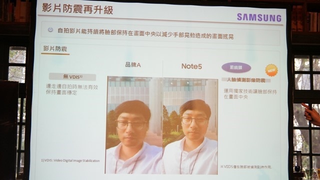 Galaxy Note 5拍攝行進時的自拍影片,結合VDIS (Video Digital Image Stabilization) 與OIS光學防手震,可減少移動時手部晃動的影響,減少影片模糊狀況發生機會,讓影片畫質盡量穩定呈現。