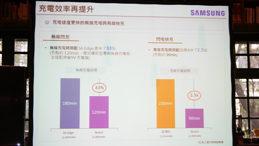 Galaxy Note5支援閃電快充,搭配原廠9V充電器,90分鐘就能充飽電。另外,Galaxy Note5也內建最新的無線閃充技術,使用專用無線閃充充電板與原廠9V充電器,只要120分鐘就能充飽電。