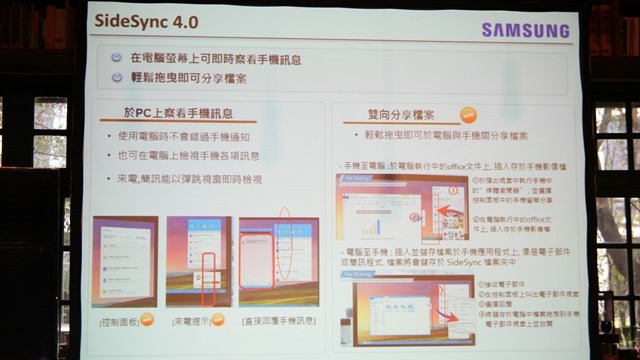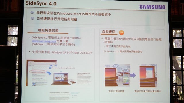 三星蠻好用的SideSync軟體,現在升級到4.0版本。只要下載安裝在桌上型電腦或筆電上,當連結連結手機後,就能在電腦上接聽電話、回覆簡訊、雙向拖曳分享電腦及手機上的檔案。