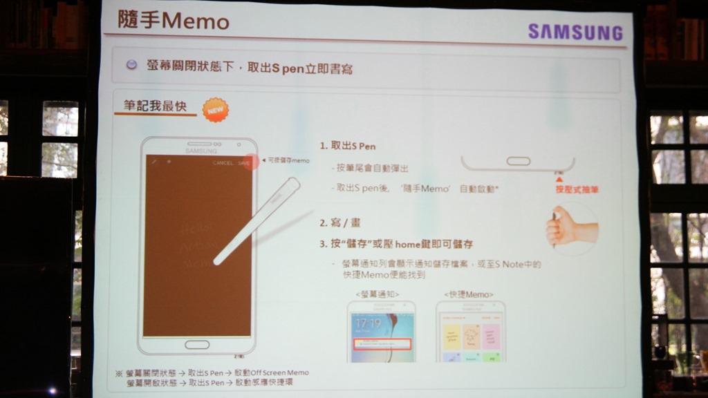 Galaxy Note5新增隨手Memo功能,當螢幕關閉時,只要取出S Pen,就能直接進行書寫,之後再按儲存或Home鍵,就會儲存到快捷Memo裡,以供之後存取使用。