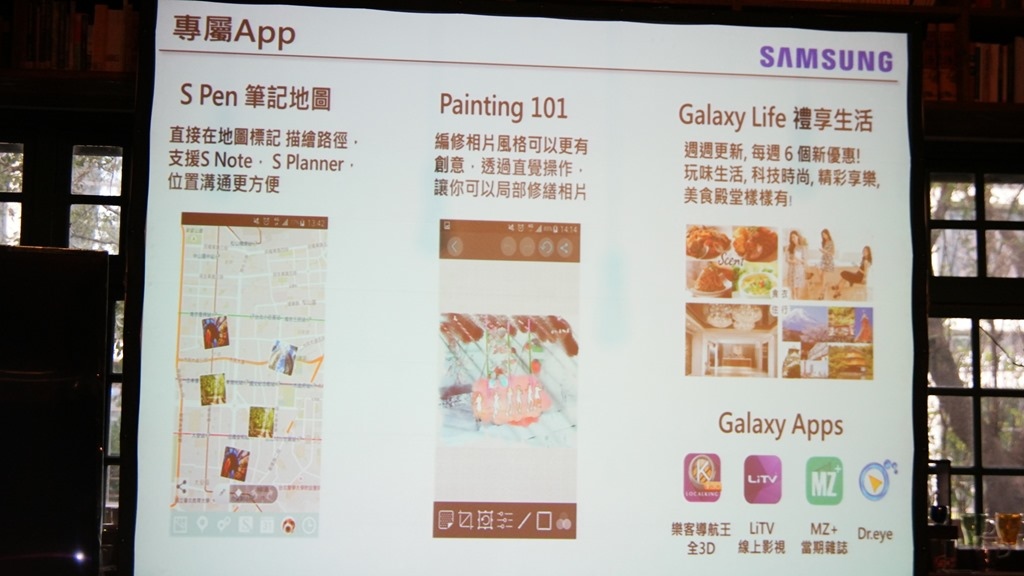 目前在Galaxy Note5中,提供兩個S Pen專用的新App。第一個「S Pen筆記地圖」App,使用Google Map搜尋功能,在找到指定地點後,可以直接拍照繪圖或以S Pen加上手寫文字,打造個人的地圖筆記。第二個「Painting 101」App,內建多樣化擬真畫布及繪圖風格,搭配S Pen使用,可以直覺操作地修繕照片。