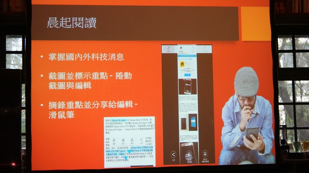 早起晨讀時,他會使用S Pen隨時擷取資訊儲存,並分享給工作伙伴。