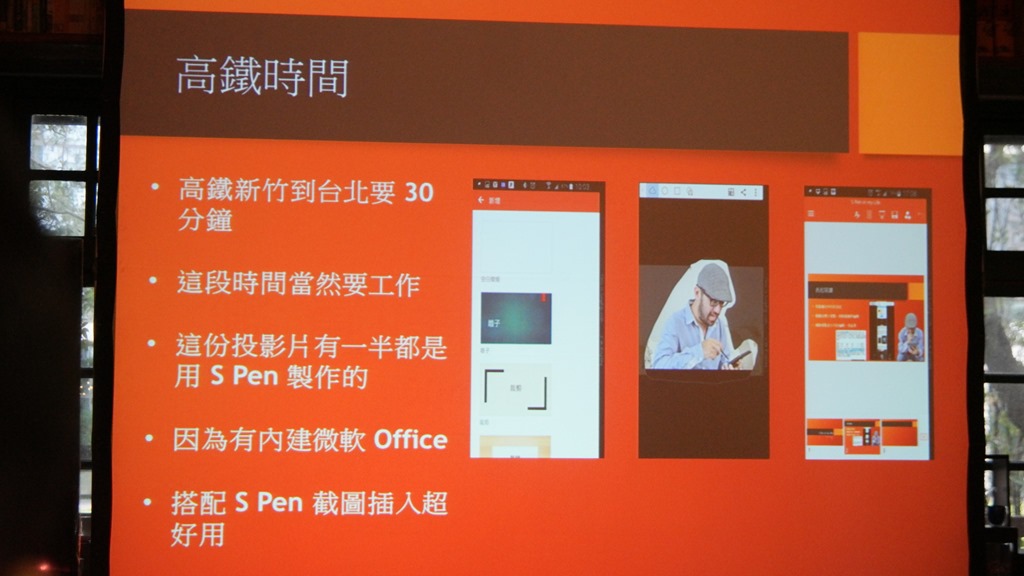 內建微軟Office的Galaxy Note 5,可以讓他在乘車時,不需拿出筆電,一樣可以進行文書作業。