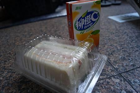 【經過詢問後得知準備了約600份早餐,筆者拿到燻雞三明治+柳橙汁】