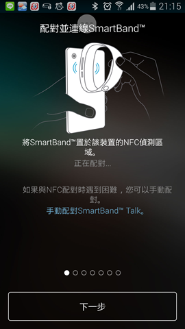 在開始正式使用前,先下載安裝SmartBand Talk App。而SmartBand Talk SWR30有內建NFC,如果手機的NFC有開啟的話,配對畫面就會出現以NFC配對的提示畫面。
