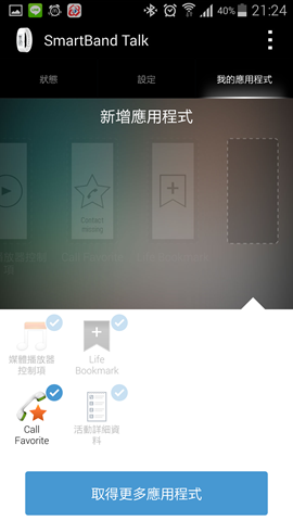 SmartBand Talk SWR30一開始內建的應用程式有4種,而目前可提供下載擴充功能的應用軟體,總共有10種。不過,受限於記憶體容量,SmartBand Talk SWR30有最多安裝10個應用程式的限制,滿了之後要加入新應用程式,就必須先刪除現有的應用程式後才能下載擴充。