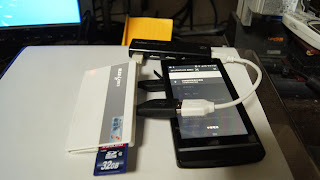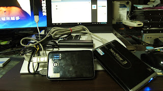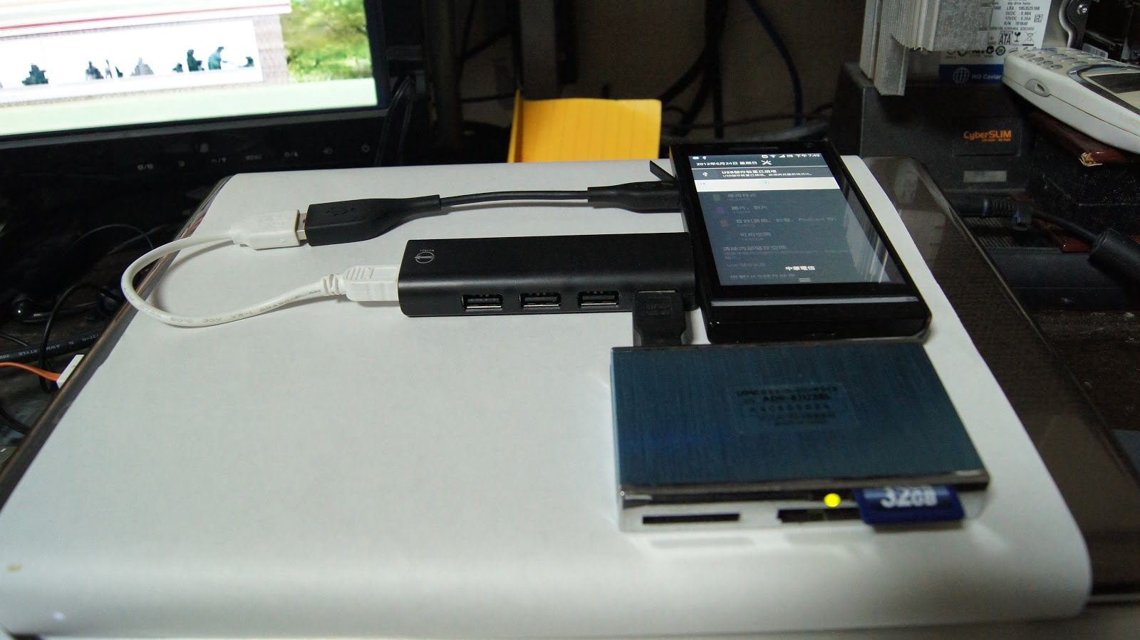使用這類型的隨身碟,最大的問題就是手機無法提供足夠的電量讓硬碟運作,所以要借助行動電源,並使用USB2.0電源線,讓USB HUB有足夠的電力。