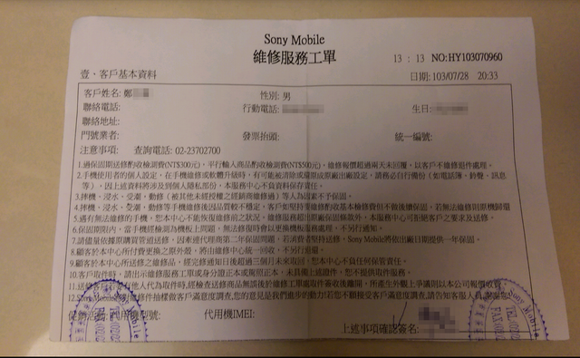 但是經過一天後,水滴還是沒消,拍出來的照片也慘不忍睹,只能乖乖的拿去西門町Sony Mobile旗艦店送修了