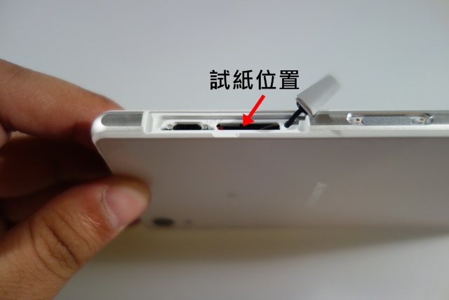 打開防水蓋,這邊要特別跟大家提醒一下,SIM卡槽旁邊的紅色方塊,那個不是試紙啦,一開始看到我也緊張了一下,但是真正的試紙是在下方箭頭的位置,要斜斜的看進去才會看到