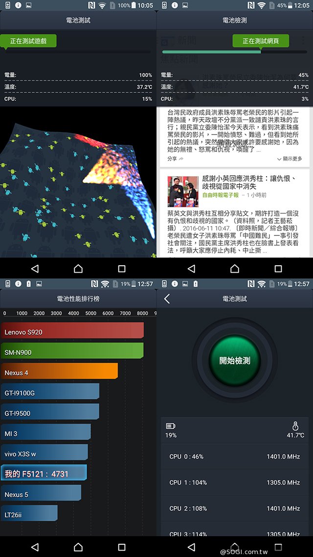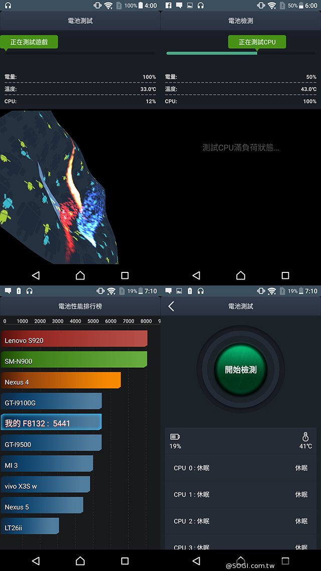 ① 安兔兔電池測試結果首先,先來看看 Xperia XZ 透過安兔兔電池測試所測得的數據,Xperia XZ 的得分為 6,375 分,相較於過去友站測得 Xperia X Performance 的 5,441分,以及 Xperia X 的 4,731 分, Xperia XZ 都要高出許多,甚至比 Samsung S7 所測得的 5,962 分都要來得高,看來電池容量增加至 2900mAh 並加入上述的電力管理來提升續航力還是有效果的。