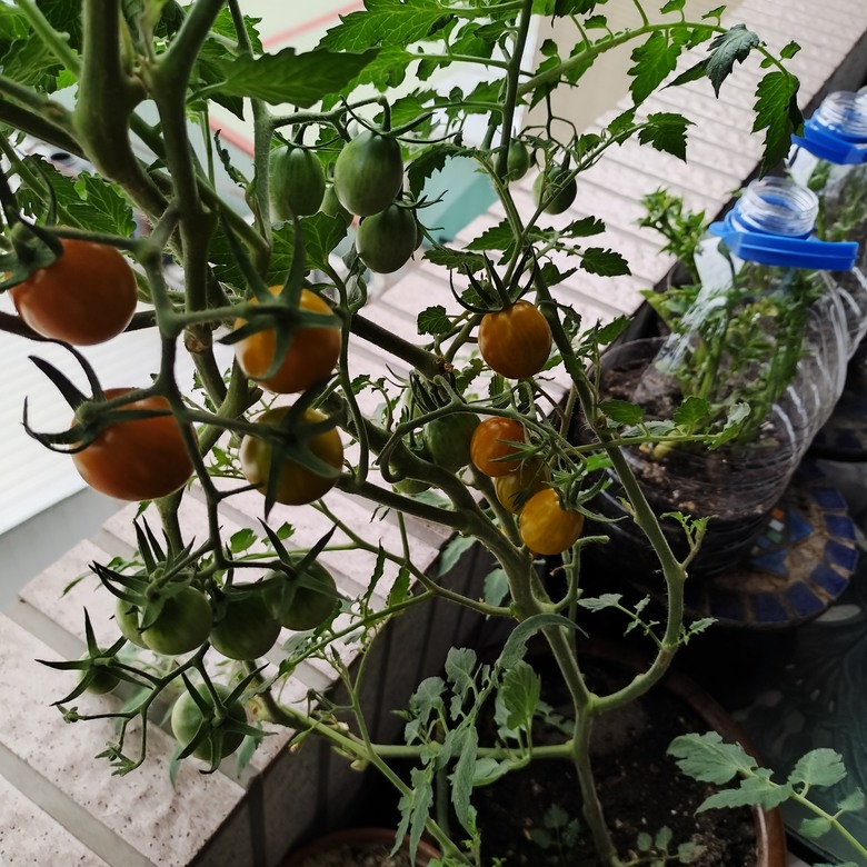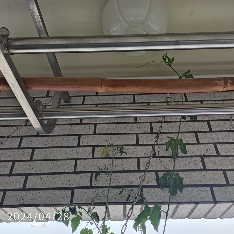 我是看了你正在種番茄,我也鼓起勇氣在狹小的陽台花架上種了番茄。