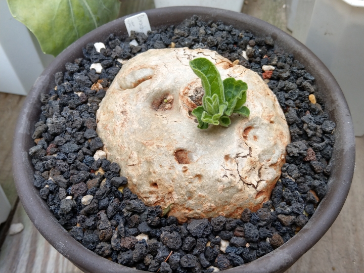 非洲紫背油點百合是風信子科麟莖植物,它是一個非常迷人的新的屬的植物,這個新的屬裏頭只有兩個品種,而且都來自南非,它滿佈迷彩斑紋的葉子及紫色的葉背是最主要的特色。它的球莖一般可長出一到三片葉,靠近或直接平放在地面上,葉片上有許多軍綠色斑點,而每片葉上的圖案都呈現不一樣的顏色排列,這讓每一棵植株都是獨一無二,葉的背面則是迷人的暗紫色,的確十分特殊。非洲紫背油點百合在春季打破休眠並立即開花,出現在葉子之間的花穗狀花序,在短梗上帶有小巧可愛淡黃色的鐘形花。這個新的物種主要因其獨特的葉子而令人著迷,但可愛的花朵則是錦上添花。冬季乾燥時植株休眠無葉,球莖多數埋沒在介質裡。