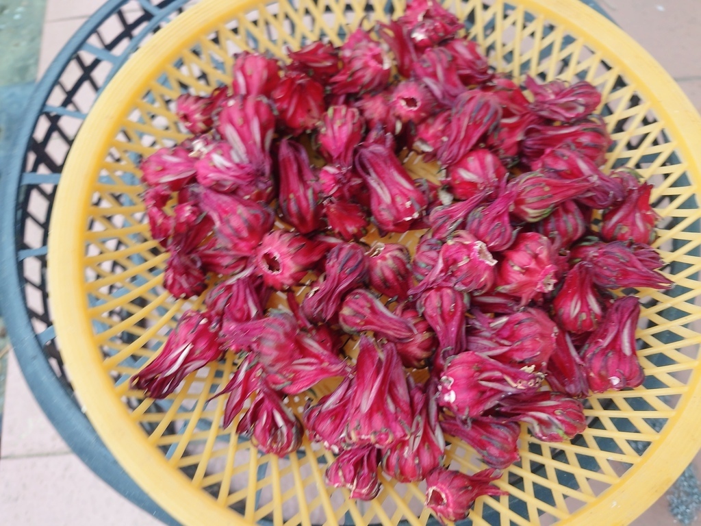 牆邊堆著自家曬的芋頭、秋葵、洛神花與青橄欖。