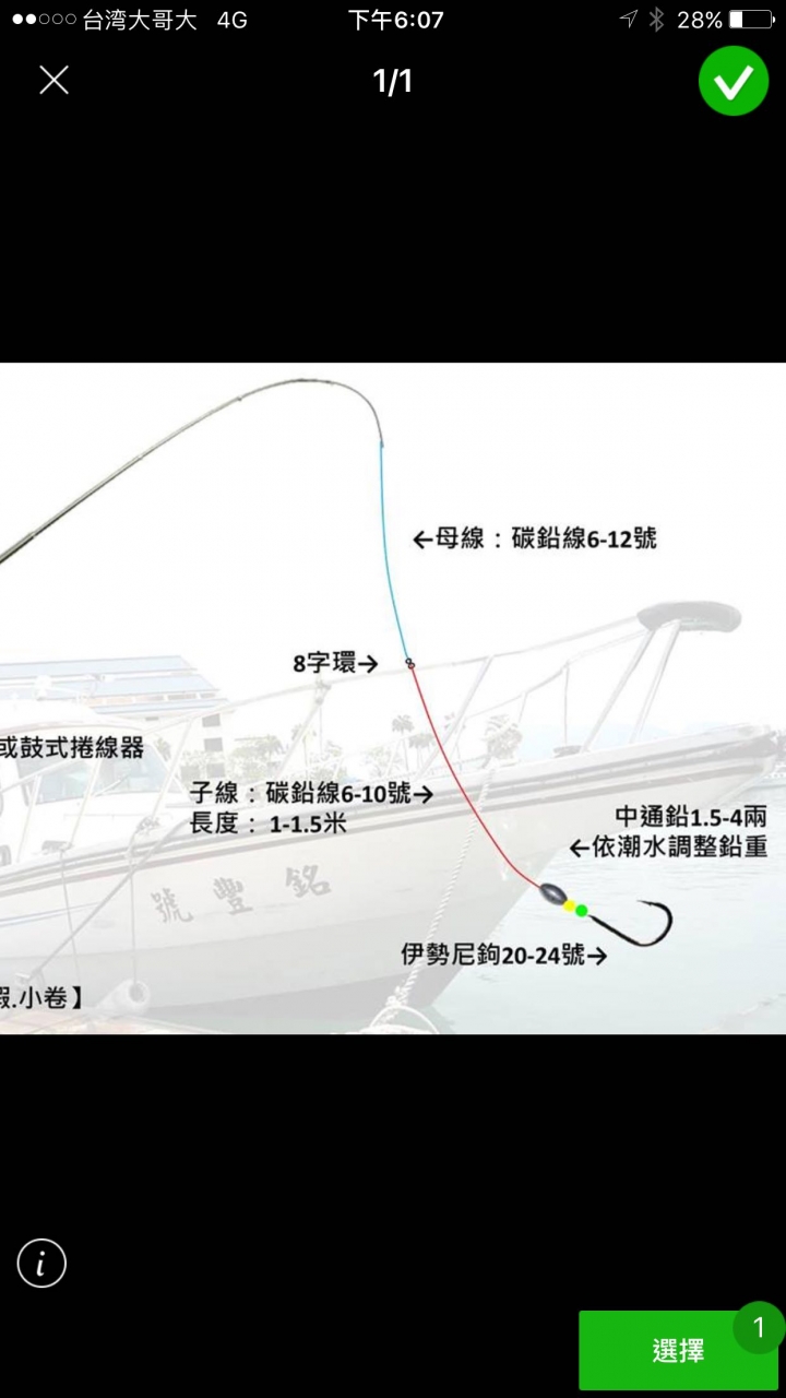 allen866129 wrote:我所貼的圖是一位船長提供的,但是我自己幾次作釣後發現,子線及母線越粗越好,我原先也使用6號卡夢線當子線,上上週中大魚,拉了半天快出水時竟然被魚修理了---斷線,所以馬上修改成10號卡夢線當子線,母線用6號PE線,我習慣在母線尾端用大顆的別針轉環,這樣斷線後更換子線釣組比較方便。我要釣魚前晚都先綁好10組以上釣組子線。以上是相關器件及我綁好後的釣組,讓你參考。 謝謝啦如果淺場(10米20米)是不是用牛車輪配個鮸魚竿就夠了??