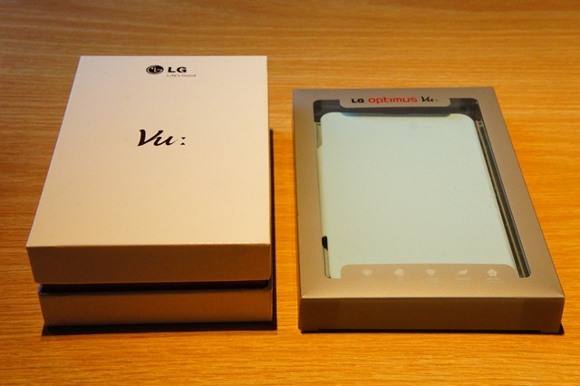 包裝盒內的物品,除了LG Optimus Vu本體,還有耳機、USB傳輸線、可接USB傳輸線的充電插頭、說明手冊、LG Tag+感應貼紙、開Micro SIM卡保護蓋的小工具,以及觸控筆。