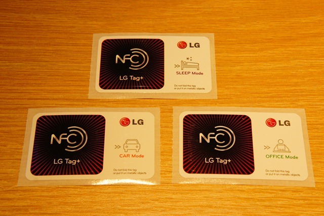 手機隨機附贈了三張LG Tag+感應貼紙,讓使用者利用NFC功能觸碰到感應貼紙後,就能讓手機內的部份設定,自動變更為感應貼紙上預先設定的設定值。