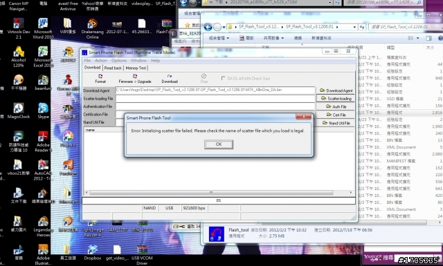 L大!!我用線刷軟體只讀的的6575線刷檔,讀6577的X710D他會顯示無法載入後來我就只好用6575的刷,刷了之後OK可以開基!不跟動您作的預設值去刷接下來把ROOT刷包放入記憶卡進入卡刷模式清除WIP然後安裝之後就開機!現在畫面就一值停留在白色畫面!L大知道如何解決嗎?是一開始我刷錯了嗎?6575的包目前用的線刷軟體是SP_FLASH_TOOL_V3.1206.01版還是要用其他線刷軟體?這是載入6577的文件包會出現的錯誤