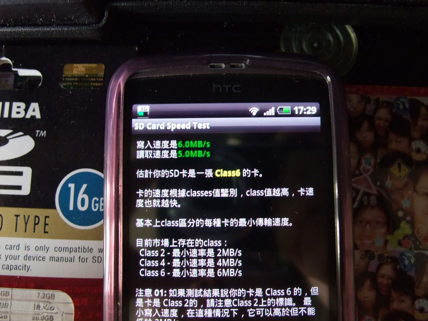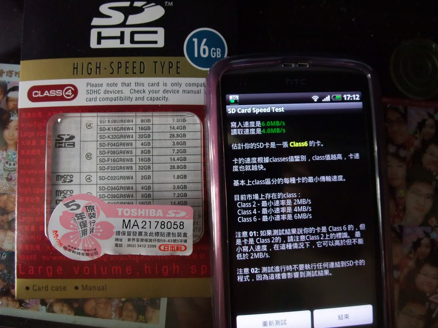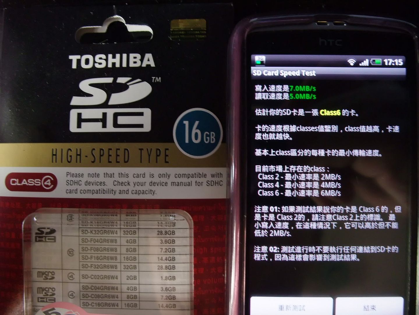 toshiba16gb class4 sdhc手機記憶卡的spd test第一次寫入速度6 mb/s讀取速度4 mb/s判定為class 6~第二次寫入速度7 mb/s讀取速度5 mb/s判定為class 6~第三次寫入速度6 mb/s讀取速度5 mb/s判定為class 6~