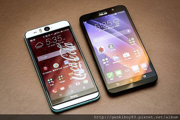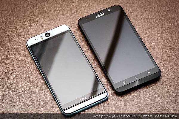 雖然Zenfone 2是5.5吋的機子,但跟5.2吋的Desire EYE比起來並沒有很明顯的大小差異,主因是Desire EYE的上下因為雙喇叭與超大前鏡頭佔用的空間比較多,所以即使EYE是5.2吋,看起來並沒有比Zenfone 2來得短