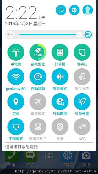 Zenfone的桌面採用的是頗受好評的ZenUI,下拉的通知因為是Android5.0的關係,所以變成兩段的方式,第一段會先出來訊息通知,再往下才會出現快速設定列